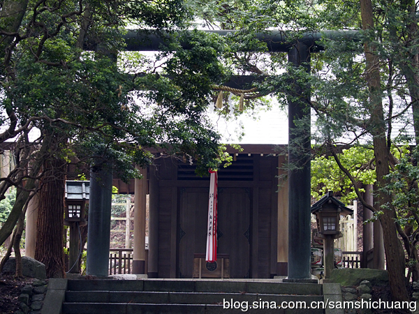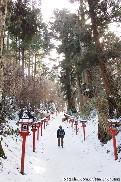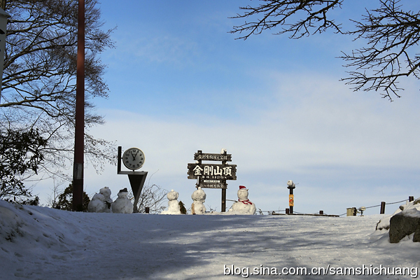 缆车线路建在金刚山的南坡。从山脚向山顶望去,满山遍野还都是郁郁葱葱的。只有从巴士车站到缆车站之间不到百米的步行道暗示着今天的路况。这段步行道下面是冰冻层,上面是一层积雪。小心翼翼的走上去还是能够的,但是如果想下来,就难上加难了。山顶的路况几乎都跟那段步行道是一样的。积雪厚的地方还勉强能走。我踉踉跄跄来到了葛木神社参道前,看见前方一位老人家健步如飞,才突然明白原来有一种户外神器叫做冰爪。