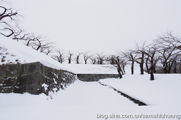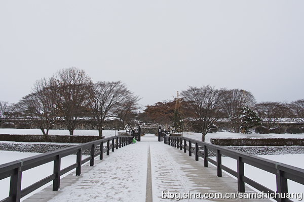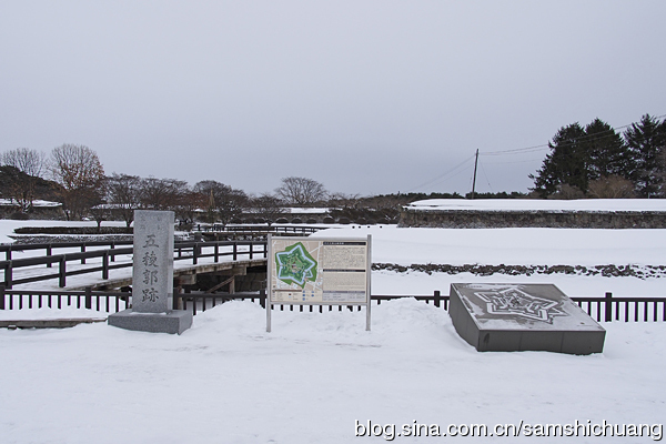 五稜郭正门外还有第六个小角,其名为半月堡。从展望台的角度,整个五稜郭形似一只大乌龟,半月堡就是乌龟的头部啦。从外部进入半月堡需要经过一之桥,而从半月堡进入五稜郭还有一座二之桥。二之桥就是乌龟的颈项。围绕着五稜郭的水堀已经完全被冰雪覆盖了。函馆居民将水堀中的冰切成方块来贩卖,称之为五稜郭冰。