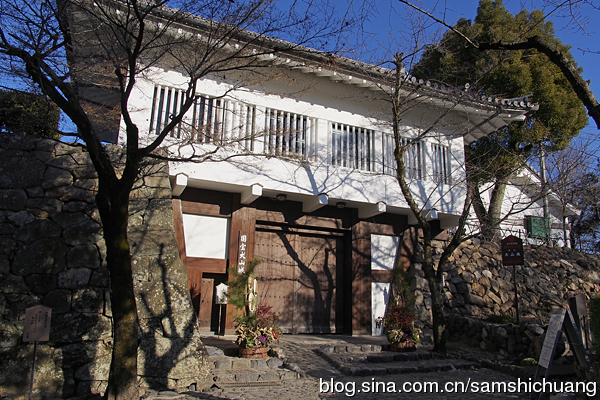 沿着木曾川北岸有一条游步道,一路向西始终可以看到上方的犬山城天守。但是到达川端丑寅橹迹后,要沿着水堀绕行至犬山城松之丸西侧的中御门迹才可以登城。经过了桐之丸,枞之丸,杉之丸后,本丸门就近在眼前了。