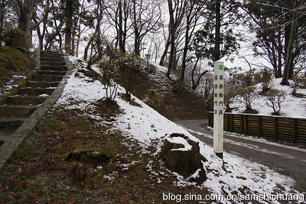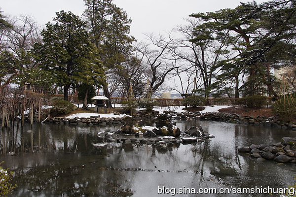 从本丸的东侧的里门绕行到二之丸。一下来就是一处别致的庭院,名为胡月池。久保田城四周的池塘都种植了许多荷花。时下只是早春,败落的荷花有还不如没有。不过到了夏天,就别有一番景色了。