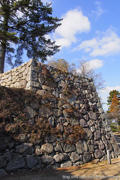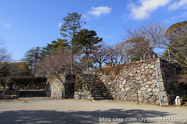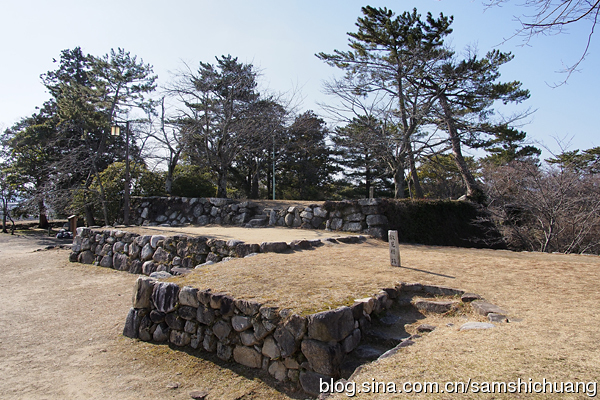 爬上金之间橹,就来到了本丸上段。敌见橹后面稍稍高出的石基座就是天守台。松阪城曾经拥有一座连接式三重五阶的天守。在江户时代早期的一场台风中,松阪城天守倒塌,此后再未被重建。