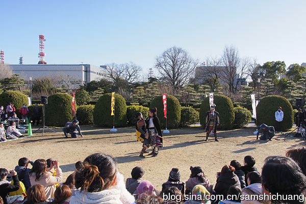 名古屋城是一座梯郭式平城。二之丸的南边是爱知县体育馆。喜爱《灌篮高手》的朋友们对这座体育馆一定不会陌生。还记得爱知之星还有将樱木花道撞翻的森重宽吗?书归正传,二之丸的北边是一处别致的庭院。在梅林旁的空地上还有历史话剧的露天表演。表演者很敬业,表情都很认真,可惜我还是听不懂。